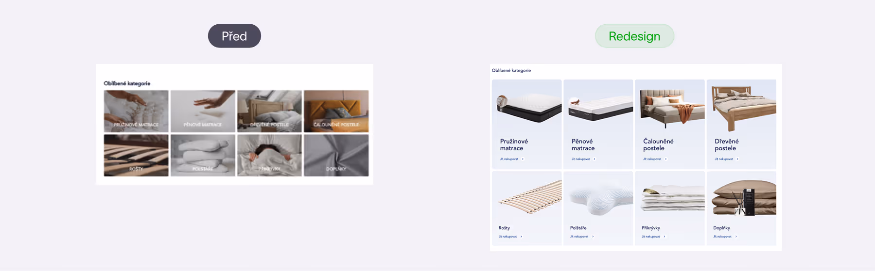 Audit ukázal, že textový rozcestník kategorií je bez vizuální opory hůř skenovatelný a uživatele při výběru zpomaluje. V redesignu jsme proto do výpisu kategorií přidali obrázky a zároveň zkrátili popisky, aby nezabíraly zbytečně místo.