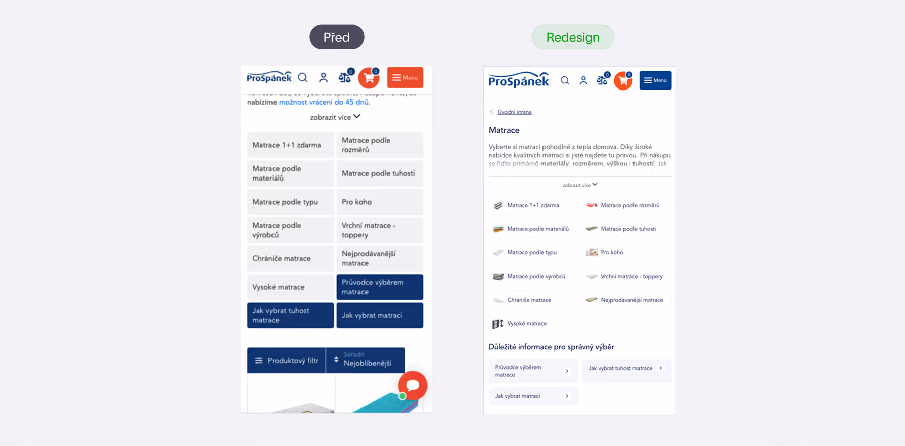 Kategorie původně obsahovala zbytečně moc textu v klíčové části viewportu. Filtr se otevíral na netradičním místě, a tak místo plynulého průchodu vznikalo zbytečné váhání. Bylo proto jasné, že i tady má smysl do designu zasáhnout.