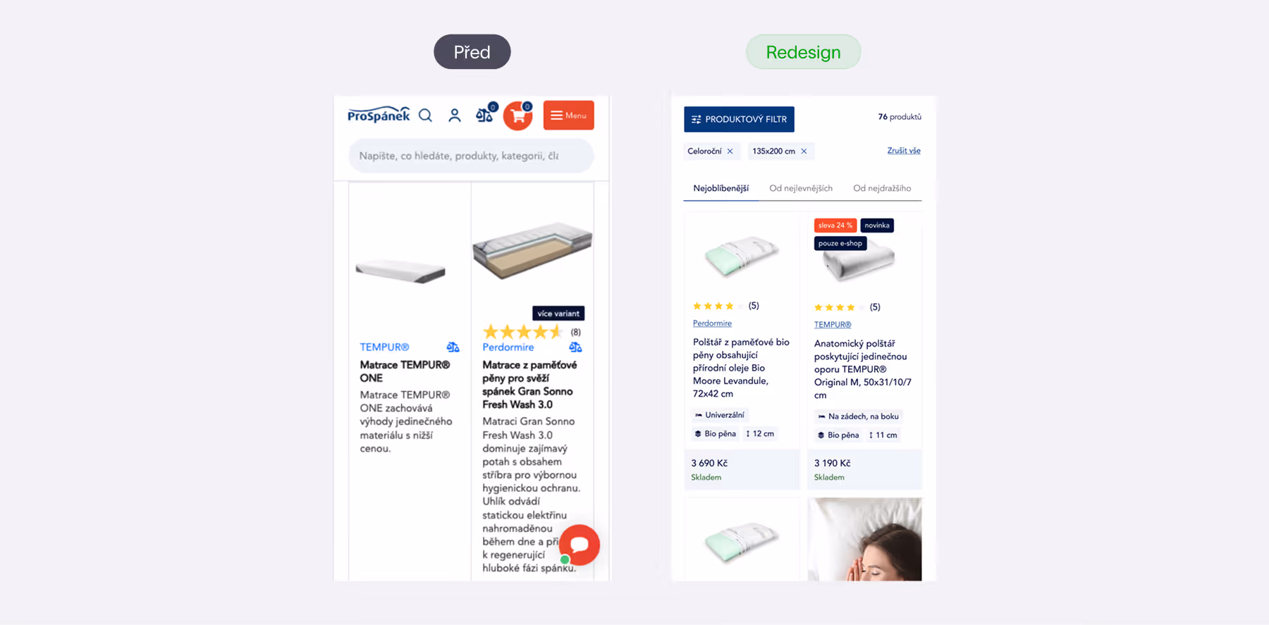 Díky širšímu layoutu konečně vynikly fotky, materiály a emoce, které jsou u produktů Prospánku klíčové. Web působí vzdušněji, prémiověji a dává produktům prostor, který si zaslouží.