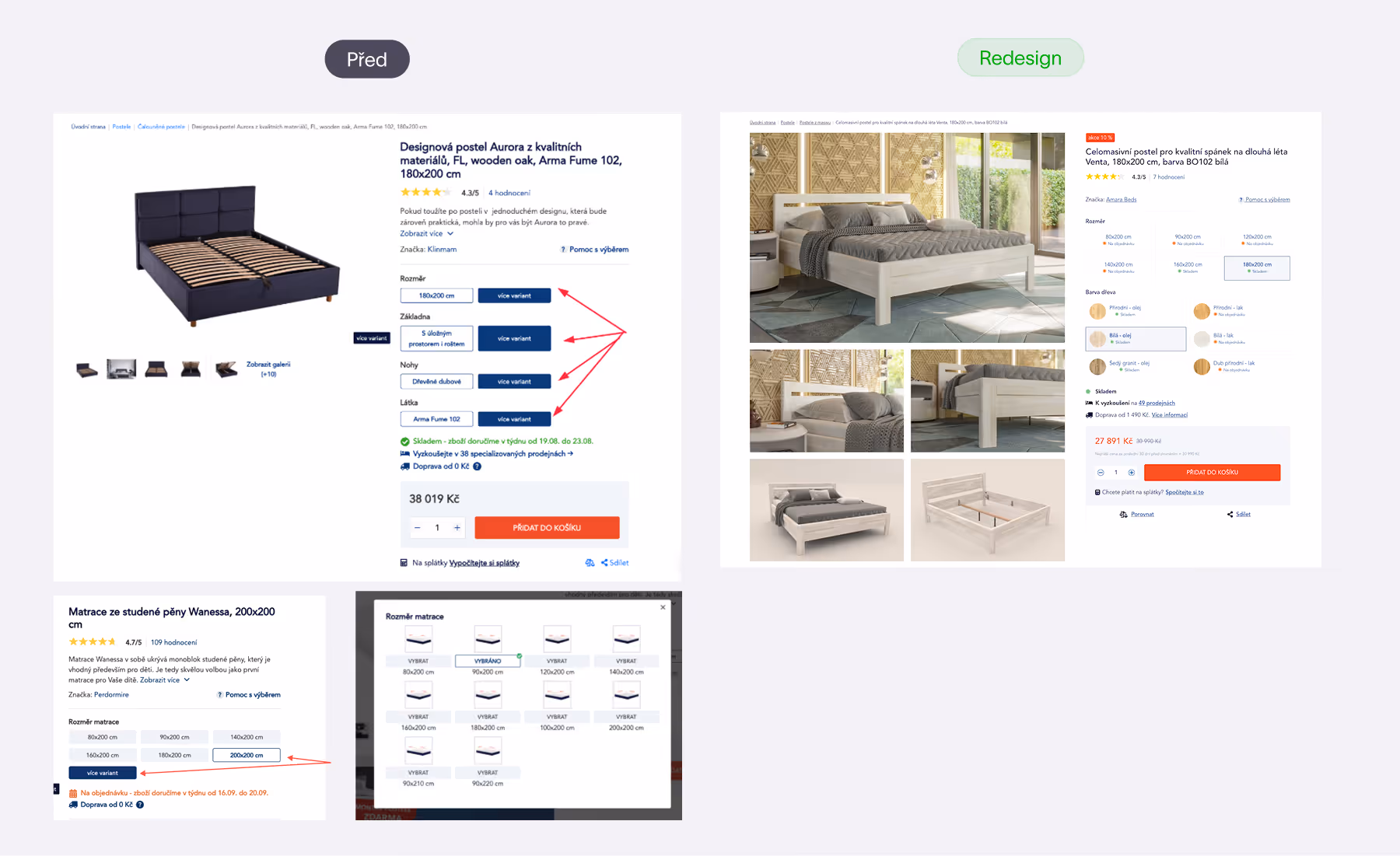 Produktový detail je klíčové místo každého e-shopu. U Prospánku se ukázalo, že problém nebyl v nabídce, ale v tom, jak složité bylo se v detailu zorientovat. A tak jsme se zaměřili na to nejdůležitější: aby bylo na první pohled jasné, co vybírám, jak produkt vypadá a kde je k dispozici.