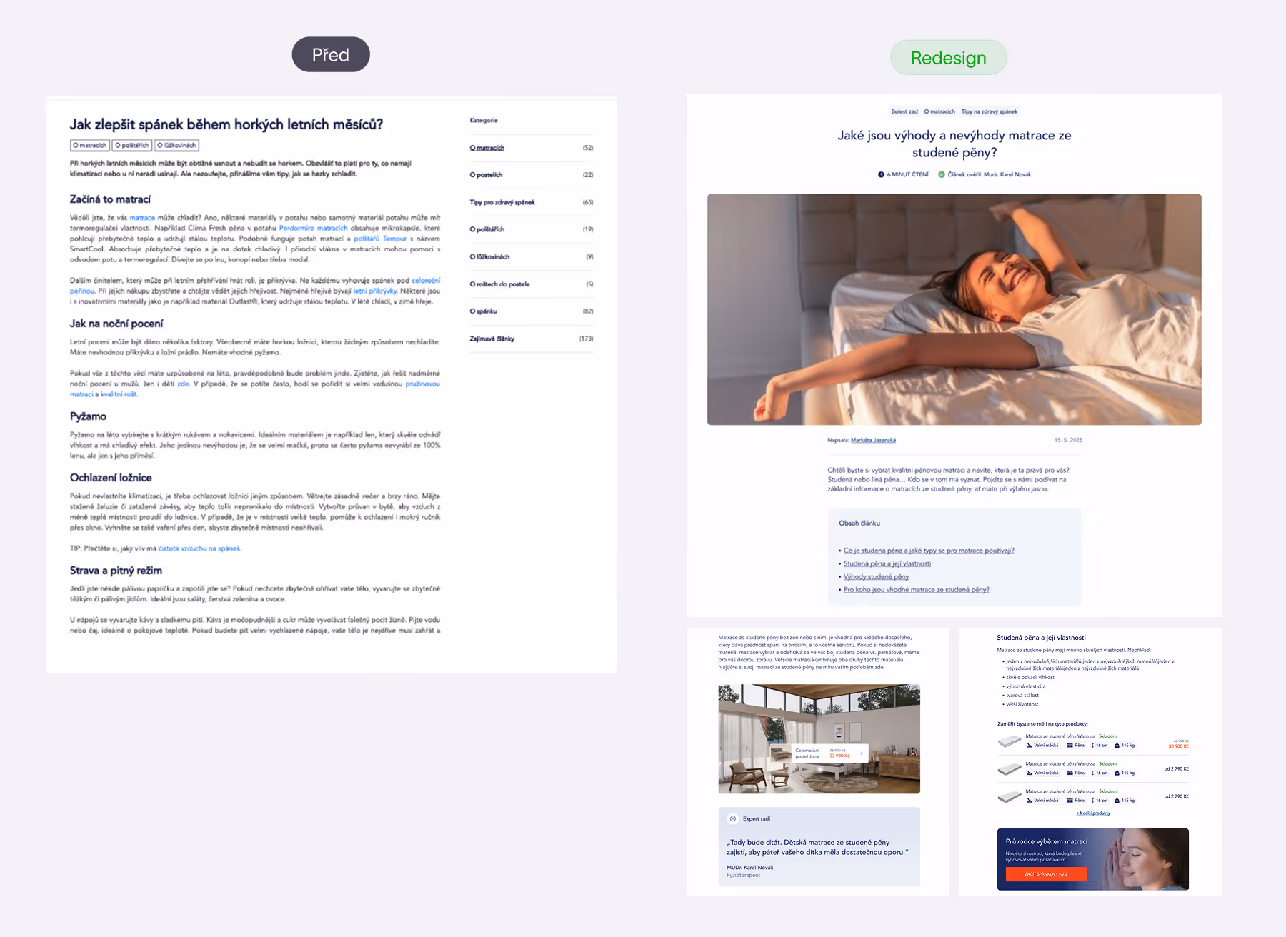 V redesignu jsme proto článek rozčlenili, proložili vizuálními prvky a doplnili relevantní produkty přímo do toku obsahu. Zároveň jsme posílili úvod a přidali jasné navazující kroky na konci článku — doporučené související články nebo tematické přehledy. Článek tak lépe drží pozornost, snáz se čte a přirozeně vede čtenáře dál.